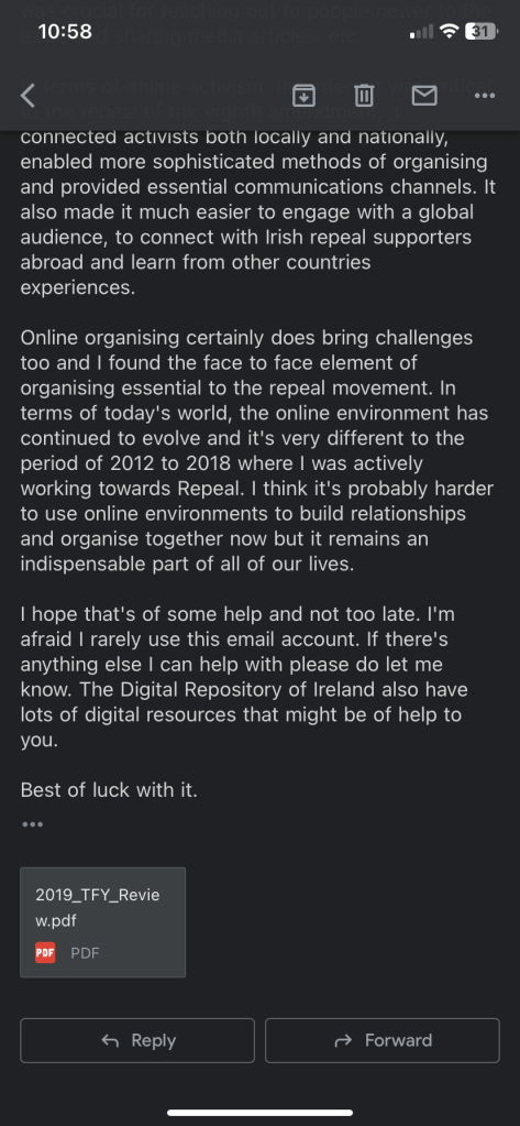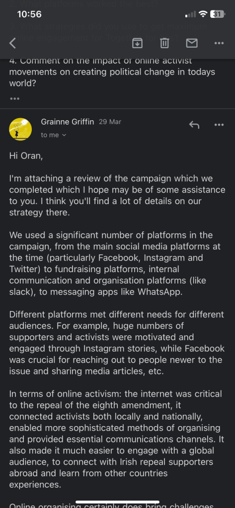 Im focusing this blog on the information I gained from my questioning of Grainne Griffin, co- director of ‘Together for Yes’, an abortions rights campaign group which campaigned successfully for a Yes vote in the 2018 referendum to rafity the Eighth Amendments constitutional ban on abortion in Ireland
